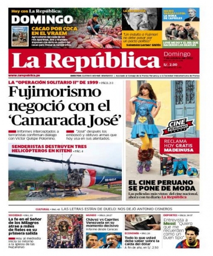 Por otro lado, el diario La República cede interés al supuesto pacto que celebró el exmandatario Alberto Fujimori con Víctor Quispe Palomino, "camarada José" en el año 1999, uno de los cabecillas actuales del terrorismo en el Valle de los Ríos Apurímac, Ene y Mantaro (Vraem).