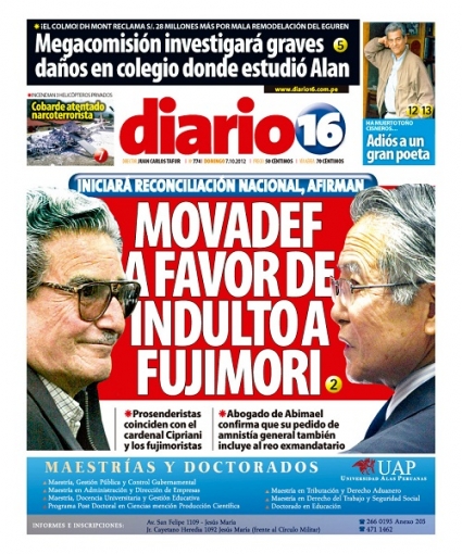 Ahora estamos con Diario 16. El subsecretario del prosenderista Movimiento por Amnistía y Derechos Fundamentales (Movadef), Alfredo Crespo, está a favor de que se le conceda el indulto humanitario al expresidente Alberto Fujimori, argumentando que de esta forma se iniciará la “reconciliación nacional”, dejando entrever que este sería el inicio del proceso para exigir el perdón presidencial para el cabecilla terrorista Abimael Guzmán, su patrocinado.