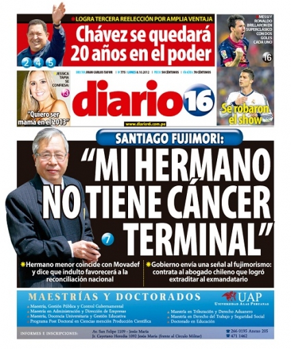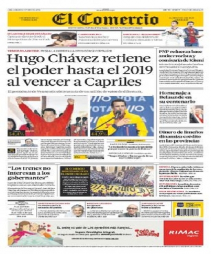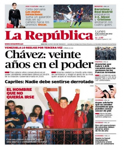 Entre los temas más destacados por la prensa escrita peruana para hoy lunes 8 de octubre, está la reelección del presidente Hugo Chávez en Venezuela, luego de hacerse con los comicios presidenciales del día de ayer.