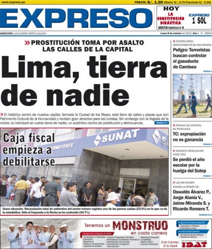 Por su parte, el periódico Expreso cede interés a los problemas que afronta el Centro de Lima. En el corazón de la ciudad la prostitución es el común denominador de las noches, al igual que la delincuencia, a pesar que la Municipalidad de Lima presidida por Susana Villarán tiene su cede justamente en esta zona.