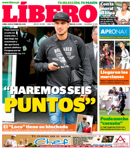 Por su parte, el vespertino Líbero hace hincapié a las palabras del delantero peruano Paolo Guerrero. El jugador de la selección peruana de fútbol prometió que el equipo buscará ganar en sus próximos partidos de visita frente a Bolivia y Paraguay, por las Eliminatorias para el Mundial de Brasil 2014.