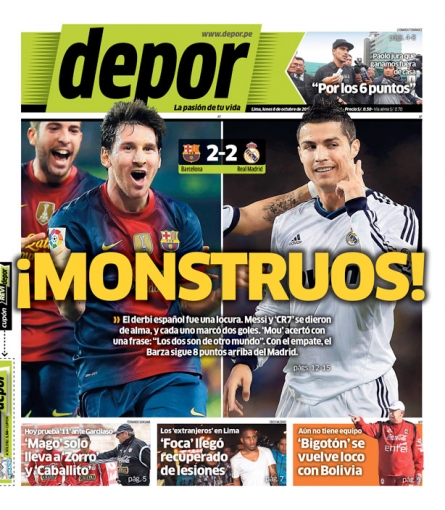 Los principales diarios deportivos del país informan en sus portadas de hoy lunes 8 de octubre, sobre el encuentro entre el FC Barcelona con Real Madrid, que terminó 2 a 2 y correspondió a una fecha más del Campeonato de Fútbol español.