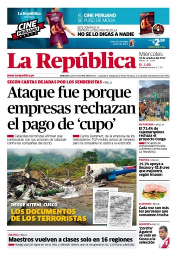 Entre los temas más destacados por la prensa escrita peruana para hoy miércoles 10 de octubre, está la probable razón por la que huestes terroristas volaron tres helicópteros de las compañías que transportan gas del consorcio Camisea, ocurrido el pasado 6 de octubre en la localidad de Kiteni ubicada en la provincia cusqueña de La Convención.