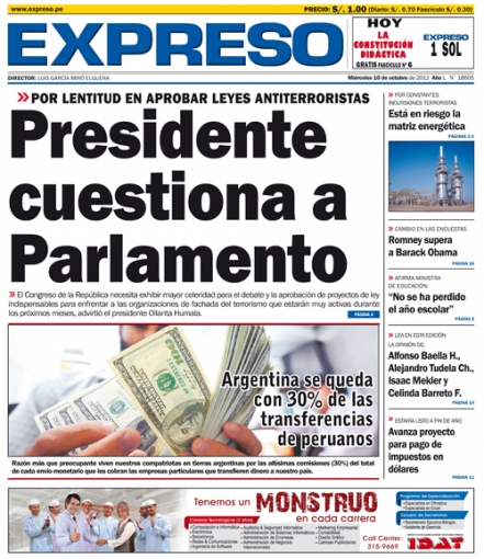 Por su parte, el vespertino Expreso cede interés al jefe de Estado Ollanta Humala. La autoridad pidió mayor celeridad en el debate y aprobación de los proyectos de ley a los integrantes del Congreso de la República, sobre todo en los relativos a los que buscan frenar las pretensiones de organizaciones de fachada del terrorismo.