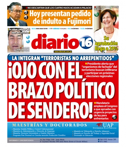 Culminamos este recorrido con el periódico La Primera, que también exhibe a algunos personajes que están a favor de que el exmandatario Alberto Fujimori reciba el indulto humanitario por supuestamente estar delicado de salud, como Laura Bozzo, Juan Luis Cipriani, Javier Valle Riestra y Alfredo Crespo, abogado del cabecilla terrorista Abimael Guzmán; mientras que Diario 16 hace eco de las palabras del mandatario Humala respecto a la aprobación de leyes contra grupos de fachada del terrorismo.