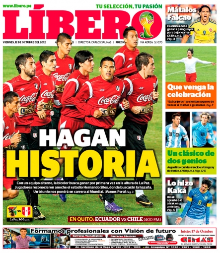 Los principales diarios deportivos del país informan en sus portadas de hoy viernes 12 de octubre, sobre el partido que Perú sostendrá hoy con Bolivia en el estadio Hernando Siles de La Paz, correspondiente a las Eliminatorias por el Mundial Brasil 2014.
