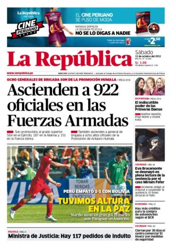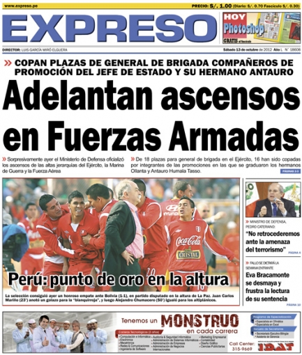 Los temas relativos a las Fuerzas Armadas ocupan la primera hoja del periódico Expreso. El Ministerio de Defensa anunció los ascensos de las altas jerarquías de las Fuerzas Armadas, siendo ocupadas 16 de las 18 plazas disponibles para general de Brigadas por integrantes de la promoción a la que perteneció el ahora presidente de la República Ollanta Humala.