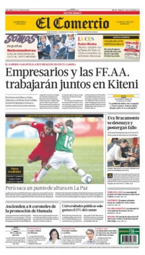 Cerramos este repaso con el decano de la prensa local, El Comercio, que exhibe en su portada un acuerdo entre el Gobierno y los empresarios para reforzar la seguridad en la localidad cusqueña de Kiteni, donde recientemente un ataque narcoterrorista dinamitó tres helicópteros que transportaban gas del consorcio Camisea.