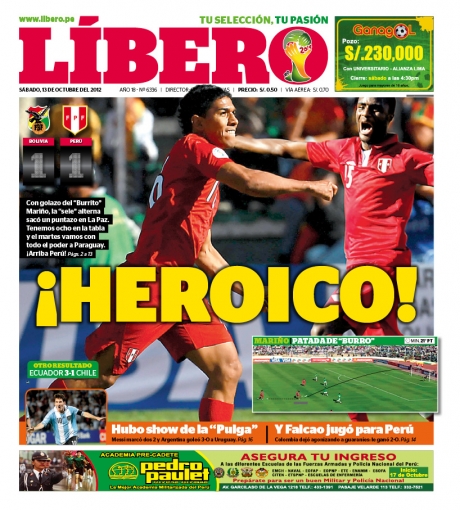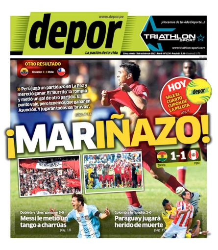 Los principales diarios deportivos del país informan en sus portadas de hoy sábado 13 de octubre, sobre el empate que obtuvo la selección peruana de fútbol ante su pare de Bolivia, en cotejo correspondiente a la Eliminatorias para el Mundial de Brasil 2014.