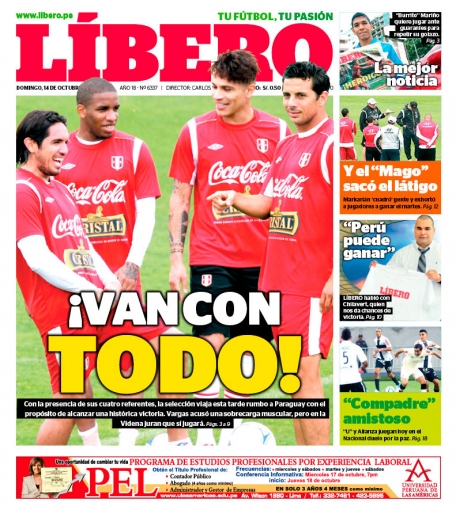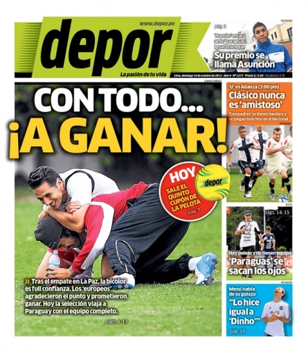 Los principales diarios deportivos del país informan en sus portadas de hoy domingo 14 de octubre, sobre el pedido especial del entrenador de la selección peruana de fútbol, Sergio Markarián, a sus dirigidos para el encuentro de este martes frente a Paraguay en Asunción por las Eliminatorias para el Mundial de Brasil 2014.