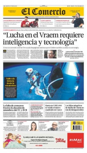 Cerramos este repaso con el decano de la prensa local, El Comercio, que muestra en su primera hoja las palabras del exministro del Interior Fernando Rospigliosi respecto a las estrategias militares contra la subversión, exhortando al Gobierno una mayor inversión en inteligencia y tecnología para esta misión.
