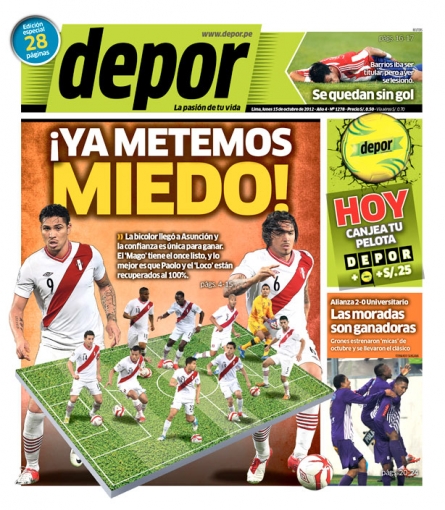 La noticia se exhibe en la primera hoja de la gaceta Depor. El estratega de la “bicolor” Sergio Markarián ya tendría listo la escuadra que peleará por el triunfo en el gramado del estadio “Defensores del Chaco”, en el cual aparece la inclusión de los citados futbolistas.