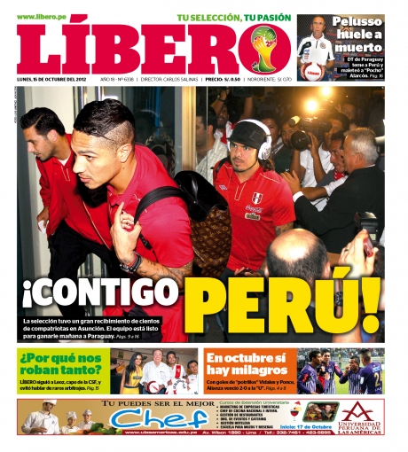 Por su parte, el vespertino Líbero muestra la llegada del combinado peruano a tierras guaranís.