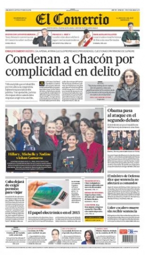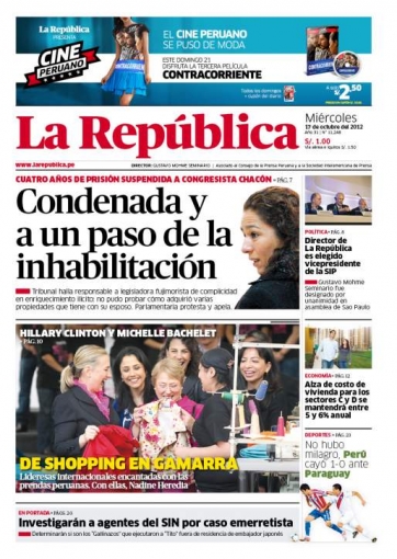 Por su parte, La República exhibe en su primera hoja la visita de la secretaria de Estado de los Estados Unidos y la exmandataria chilena, Hillary Clinton y Michelle Bachelet respectivamente, al emporio comercial de Gamarra ubicado en el distrito limeño de La Victoria, donde se realiza el concurso “Me pongo Gamarra”.