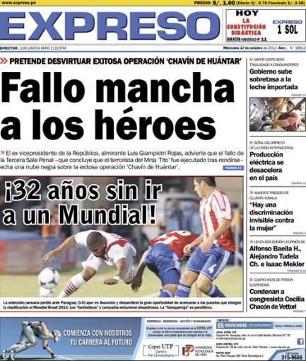 Los temas relacionados al caso “Chavín de Huántar” aparecen en la presentación de Expreso. El almirante (r) Luis Giampietri se mostró preocupado por el fallo de la Tercera Sala Penal Liquidadora respecto al conocido operativo, cuya principal conclusión es que el emerretista Eduardo Cruz Sánchez alias “Tito” fue ejecutado luego de rendirse y tras la liberación de los rehenes, opinando que ciertas ONG desean llevar esta situación a la Corte Interamericana de Derechos Humanos.