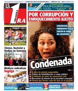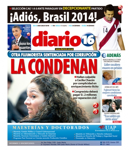 Entre los temas más destacados por la prensa escrita peruana para hoy miércoles 17 de octubre, están los cuatro años de prisión suspendida que recibió la legisladora Cecilia Chacón del partido Fuerza 2011, por el delito de complicidad de enriquecimiento ilícito con su padre Walter Chacón Málaga, quien fue Ministro del Interior durante el régimen fujimorista.