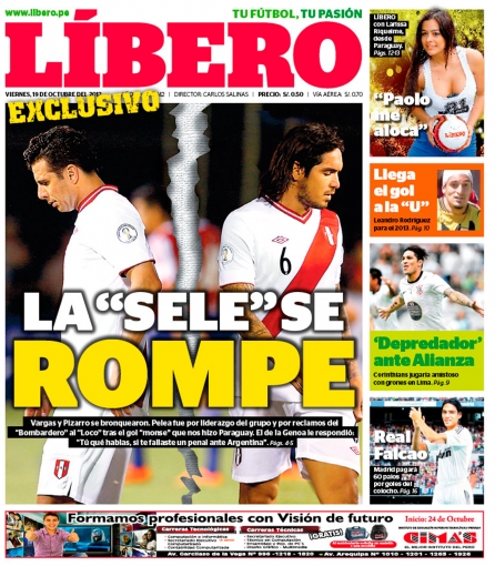 Los principales diarios deportivos del país informan en sus portadas de hoy viernes 19 de octubre, sobre una supuesta pelea entre Claudio Pizarro y Juan Manuel Vargas luego de la derrota de la selección peruana frente a Paraguay por las Eliminatorias.