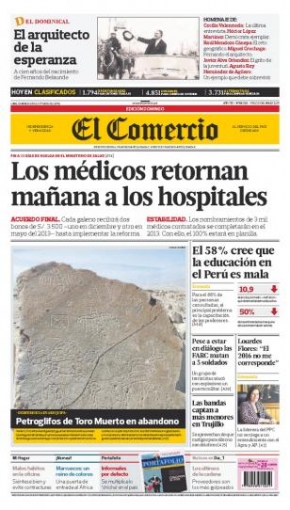 Por su parte, La República exhibe los logros de los médicos peruanos que permitieron la suspensión de su huelga indefinida. El titular de la Federación Médica Peruana (FMP), César Palomino, indicó que sus representados decidieron levantar la protesta por el compromiso del Ministerio de Salud (Minsa) de nombrar al 100% de sus colegas contratados por el sistema CAS en el próximo año y un incremento inmediato en su salario, que consiste en un mínimo de 1.500 nuevos soles desde julio de 2013.