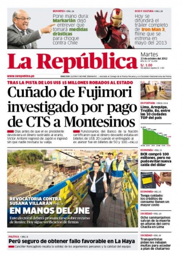 Entre los temas más destacados por la prensa escrita peruana para hoy martes 23 de octubre, está la supuesta implicancia de Víctor Aritomi Shinto, cuñado del expresidente de la República Alberto Fujimori, en el polémico e ilícito pago de 15 millones de dólares al exasesor presidencial Vladimiro Montesinos por el concepto de Compensación por Tiempo de Servicios (CTS).
