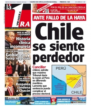 De otro lado, La Primera cede importancia al diferendo marítimo con Chile. El canciller chileno Alfredo Moreno sostuvo que la Corte de La Haya podría trazar una frontera marítima con el Perú diferente a la actual, sustentada por los convenios de 1952 y 1954.