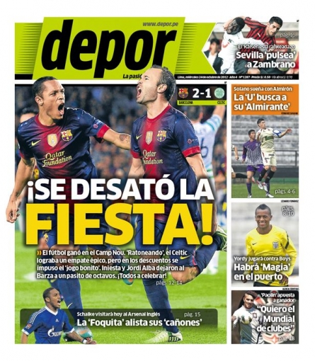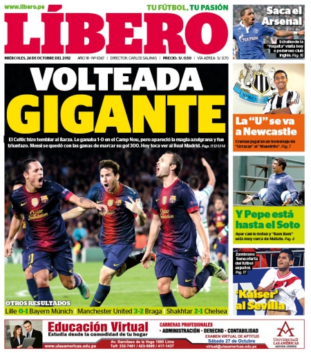 Los principales diarios deportivos del país informan en sus portadas de hoy miércoles 24 de octubre, de la remontada del FC Barcelona ante el Celtic de Escocia en el estadio Camp Nou, por la Champions League.