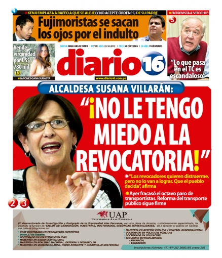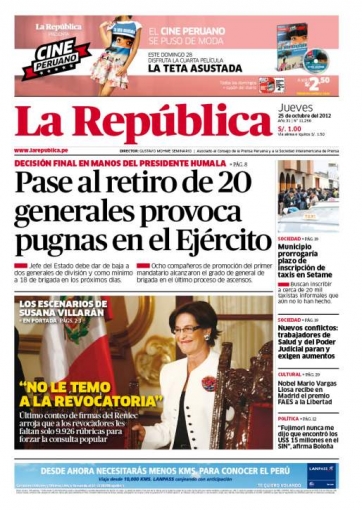 Entre los temas más destacados por la prensa escrita peruana para hoy jueves 25 de octubre, están las expresiones de la alcaldesa de Lima Susana Villarán sobre la campaña de revocatoria en su contra y a la recolección de firmas de sus opositores para el acceso a la consulta pública correspondiente.