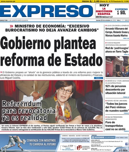“Gobierno plantea reforma de Estado”. El titular es de Expreso y hace eco a las palabras del ministro de Economía y Finanzas Luis Miguel Castilla y su opinión respecto a la gerencia pública, que al parecer será reestructurada de manera profunda para mejorar la eficiencia del Estado.