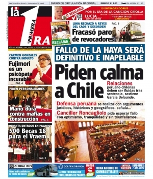 Por su parte, La Primera dedica su edición al diferendo marítimo entre Perú y Chile. El canciller peruano Rafael Roncagliolo pidió a la población esperar con optimismo la sentencia de la Corte de La Haya, “pero sin caer en pesimismos o triunfalismo”.