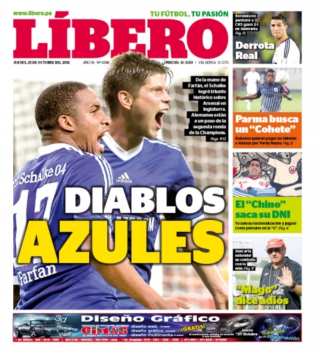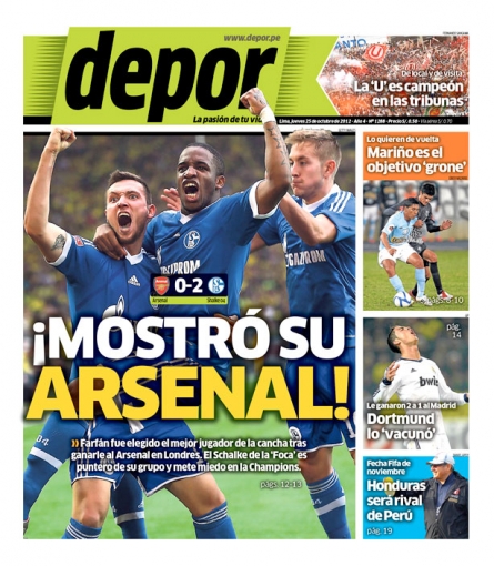 Los principales diarios deportivos del país informan en sus portadas de hoy jueves 25 de octubre, sobre la victoria del Schalke 04 del delantero peruano Jefferson Farfán frente al Arsenal en suelo inglés por la UEFA Champions League.