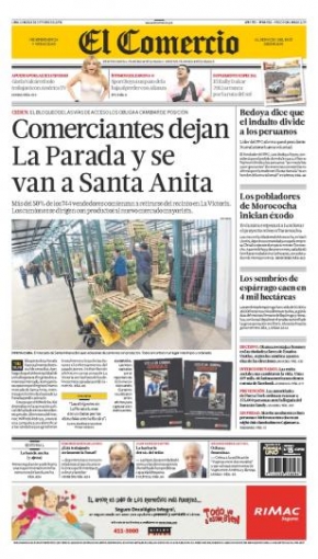 Cerramos este repaso con el decano de la prensa local, El Comercio, que también pone en su portada el traslado de los comerciantes de La Parada al centro de abastos de Santa Anita; al igual que Perú 21.