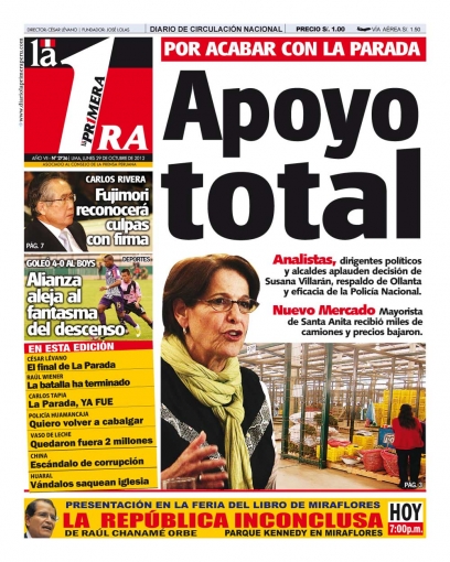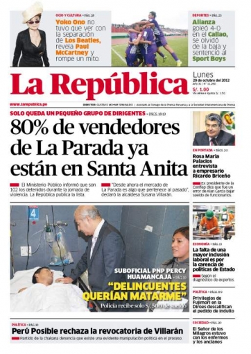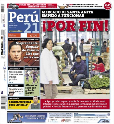 Entre los temas más destacados por la prensa escrita peruana para hoy lunes 29 de octubre, está el movimiento pacífico que comienza a presentarse en lo que antes fue el mercado mayorista La Parada, cuya sede se ubicaba en el distrito de La Victoria, lo que ha permitido que la mayoría de los comerciantes del primero estén listos para comenzar a ofrecer sus productos en el nuevo mercado mayorista de Santa Anita.