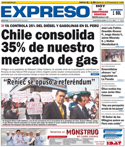 Por su parte, Expreso pone más énfasis a los temas económicos. El expresidente de PetroPerú, César Gutiérrez, sostuvo que la vida económica del país podría verse perjudicada a corto plazo si el mercado local de combustibles sigue siendo manejado por dos o tres empresas extranjeras, tras conocer que la firma chilena Angellini es propietaria del 50% de acciones de la empresa Colombiana Peruana de Gas Natural (PGM) a través de la organización Copec, y la influencia de la estatal sureña Empresas de Petróleo de Chile (ENAP).