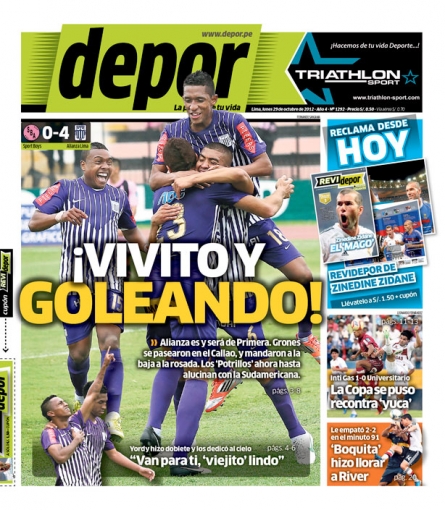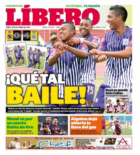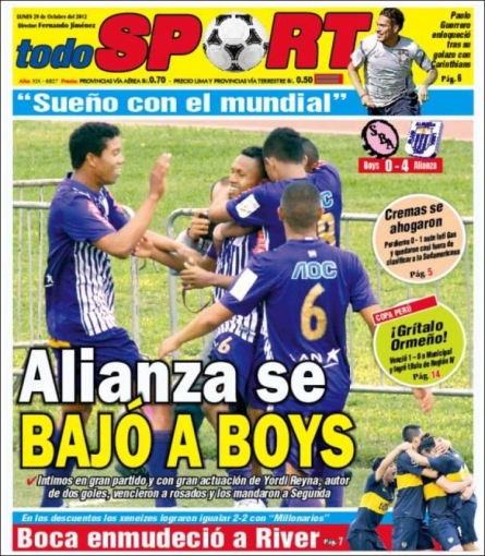 Los principales diarios deportivos del país informan en sus portadas de hoy lunes 29 de octubre, sobre la holgada victoria del subcampeón Alianza Lima sobre Sport Boys, en el estadio Miguel Grau del Callao.