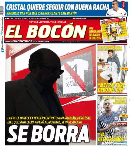 Las palabras del “Mago” aparecen en la primera hoja de El Bocón. El estratega advirtió que si no logra colocar a la “bicolor” en el próximo certamen internacional, dará un paso al costado. “Si Perú no aparece en el próximo mundial, me voy”, aseguró en conferencia de prensa, calificando además al balompié local como “deficitario, improductivo, importador y desordenado”.