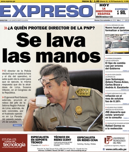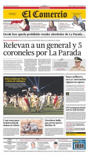 Entre los temas más destacados por la prensa escrita local para hoy viernes 2 de noviembre, está el relevo de cinco coroneles y a un general de la Policía Nacional del Perú (PNP), a causa de la operación fallida en el exmercado mayorista La Parada del pasado jueves 25 de octubre, donde perdieron la vida dos personas y quedaron heridos más de cien.