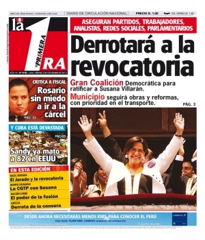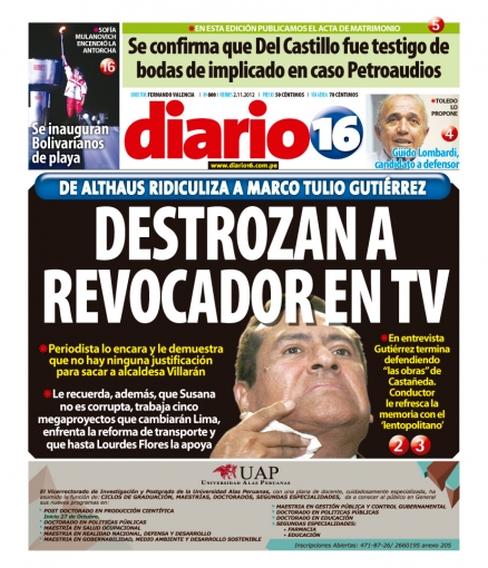 Ahora es el turno de Diario 16. El vespertino cede interés a la picante entrevista que protagonizó el periodista Jaime de Althaus con Marco Tulio Gutiérrez, uno de promotores de la revocatoria contra la alcaldesa de Lima Susana Villarán, siendo el tema de fondo la próxima consulta popular que definirá el destino de la controvertida autoridad edil.