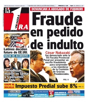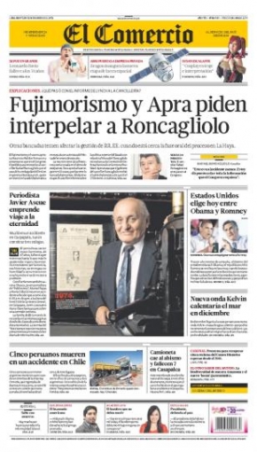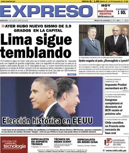 Entre los temas más destacados por la prensa escrita peruana para hoy martes 6 de noviembre, figura los comicios presidenciales en Estados Unidos que se viene realizando a nivel de todos sus estados. Los dos principales candidatos en liza, el representante del Partido Demócrata, Barack Obama, y al abanderado de la bancada republicana, Mitt Romney.