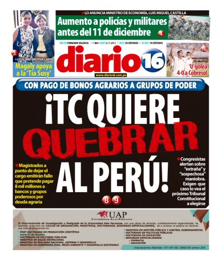 “¡TC quiere quebrar al Perú!”. Este título corresponde a la presentación de Diario 16 y se refiere al Tribunal Constitucional. De acuerdo a este medio, los integrantes de esa instancia estarían preparando los mecanismos necesarios para que el Estado peruano desembolse una deuda millonaria de los bonos de la reforma agraria, que en la mayoría de los casos ya no estarían bajo la supervisión de sus dueños originales o descendientes.