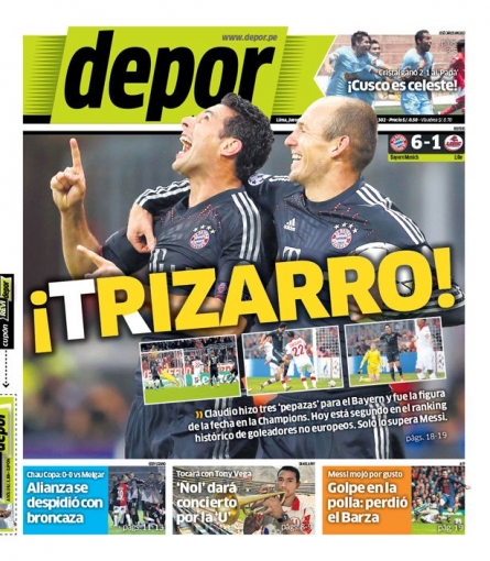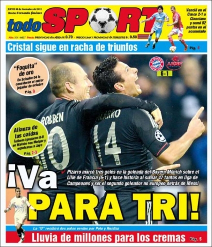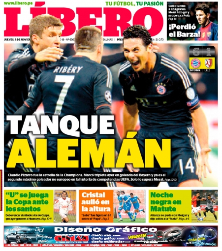 Los principales diarios deportivos del país informan en sus portadas de hoy jueves 8 de noviembre, sobre la gran actuación del delantero peruano Claudio Pizarro en la Liga de Campeones de la UEFA, donde marcó tres goles en la victoria que su equipo, Bayer Munich, logró ante el Lille francés.
