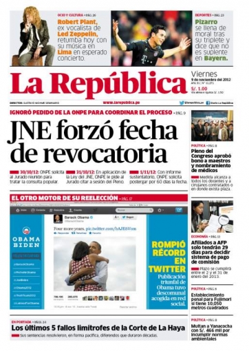 De otro lado, La República toca algunas anécdotas que dejó el último proceso electoral en Estados Unidos. Una fotografía en Facebook sobre la reelección de Barack Obama en EE.UU donde se lo ve abrazando a su esposa Michelle, se ha convertido en la imagen que tiene más ‘me gusta’ en la historia de la red social.