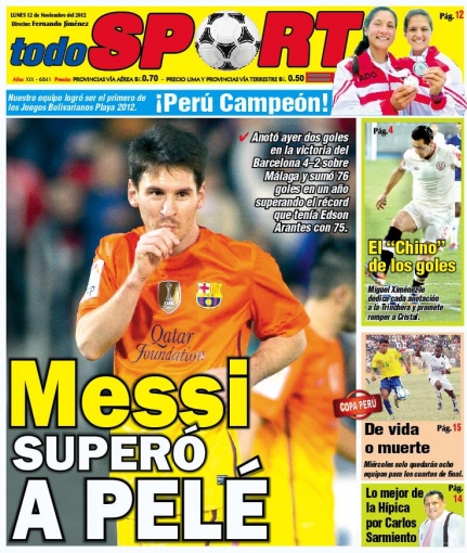 Los principales diarios deportivos del país informan en sus portadas de hoy lunes 12 de noviembre, sobre el sobresaliente nivel del delantero argentino Lionel Messi en el FC Barcelona, donde acaba de instaurar una nueva marca de goles a nivel mundial.