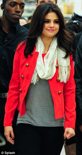 Vestida elegantemente con una chaqueta roja, bufanda marfil, top negro a rayas y unos pantalones negros, la cantante de 20 años de edad, forzó una sonrisa mientras promociona su línea de moda.