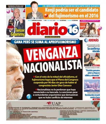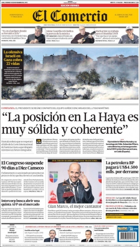 Entre los temas más destacados por la prensa escrita peruana para hoy viernes 16 de noviembre, se encuentran las expresiones vertidas por el jefe de Estado peruano Ollanta Humala respecto al diferendo que sostiene Chile con su país, argumentando que entre ambas naciones no existen delimitaciones marítimas.