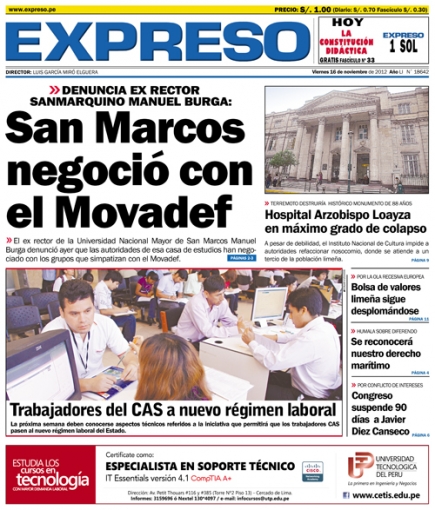 “San Marcos negoció con el Movadef”. El título inicia el desarrollo de la información en Expreso, y provienen del exrector de la Universidad Nacional Mayor de San Marcos (UNMSM), Manuel Burga, quien reveló que algunas autoridades de esta casa de estudios ha sostenido negociaciones con los grupos que simpatizan con el prosenderista Movimiento por la Amnistía y Derechos Fundamentales (Movadef), con el propósito de administrarla a conveniencia.