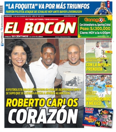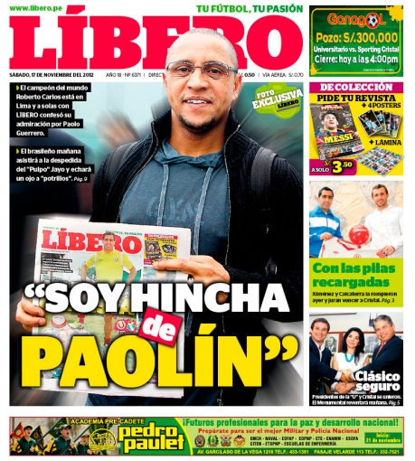 Los principales diarios deportivos del país informan en sus portadas de hoy sábado 17 de noviembre, de las palabras de elogio que tuvo el exlateral izquierdo de la selección brasilera de fútbol, Roberto Carlos, para el delantero peruano Paolo Guerrero.
