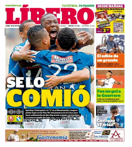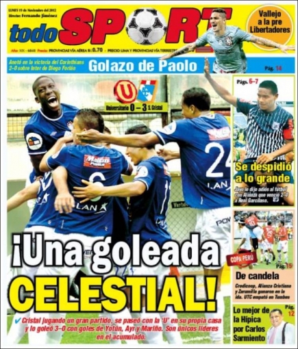 Los principales diarios deportivos del país informan en sus portadas de hoy lunes 19 de noviembre, sobre la abultada victoria de Sporting Cristal por 3 goles a 0 sobre Universitario de Deportes, en el gramado del mismísimo Estadio Monumental de Ate Vitarte.
