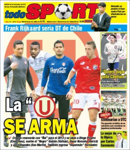 Por su parte, el vespertino Todo Sport trae novedades respecto al mercado peruano de fichajes. Todo parece indicar que el argentino Carlos Galván y Raúl Fernández retornarían a Universitario de Deportes para el año 2013, a pedido del estratega Nolberto Solano.