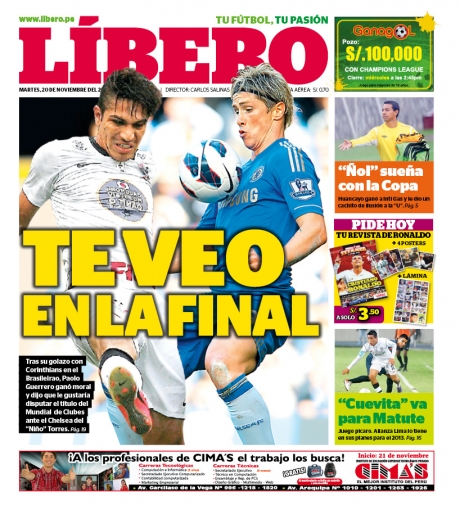 Los principales diarios deportivos del país informan en sus portadas de hoy martes 20 de noviembre, sobre el buen momento que atraviesa el delantero peruano Paolo Guerrero en el brasilero Corinthians, donde viene marcando de forma seguida y se ha convertido en una de sus figuras.