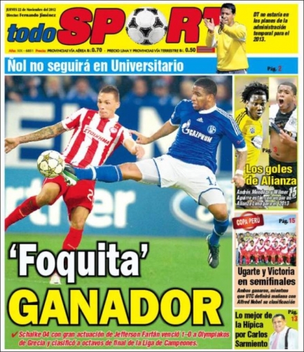 Los principales diarios deportivos del país informan en sus portadas de hoy jueves 22 de noviembre, sobre la destacada participación del delantero peruano Jefferson Farfán en la victoria de su equipo Schalke 04 sobre el Olympiakos, lo que le permite acceder directamente a los octavos de final de la Champions League.