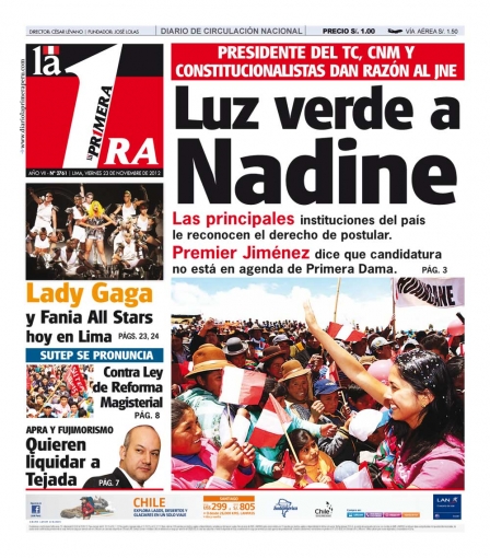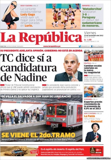 Finalizamos este recorrido con el decano de la prensa local, El Comercio, que advierte de la posibilidad de que el Sindicato Unitario de Trabajadores en la Educación del Perú (SUTEP) realice otra huelga, por la nueva ley de la Reforma Magisterial que promueve la ministra de Educación Patricia Salas; mientras que La Primera también cede interés a Nadine Heredia y a su probable candidatura.